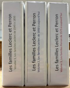• 3 classeurs d’informations généalogiques et historiques sur les Leclerc et les Perron Accessibles au local de la Société.